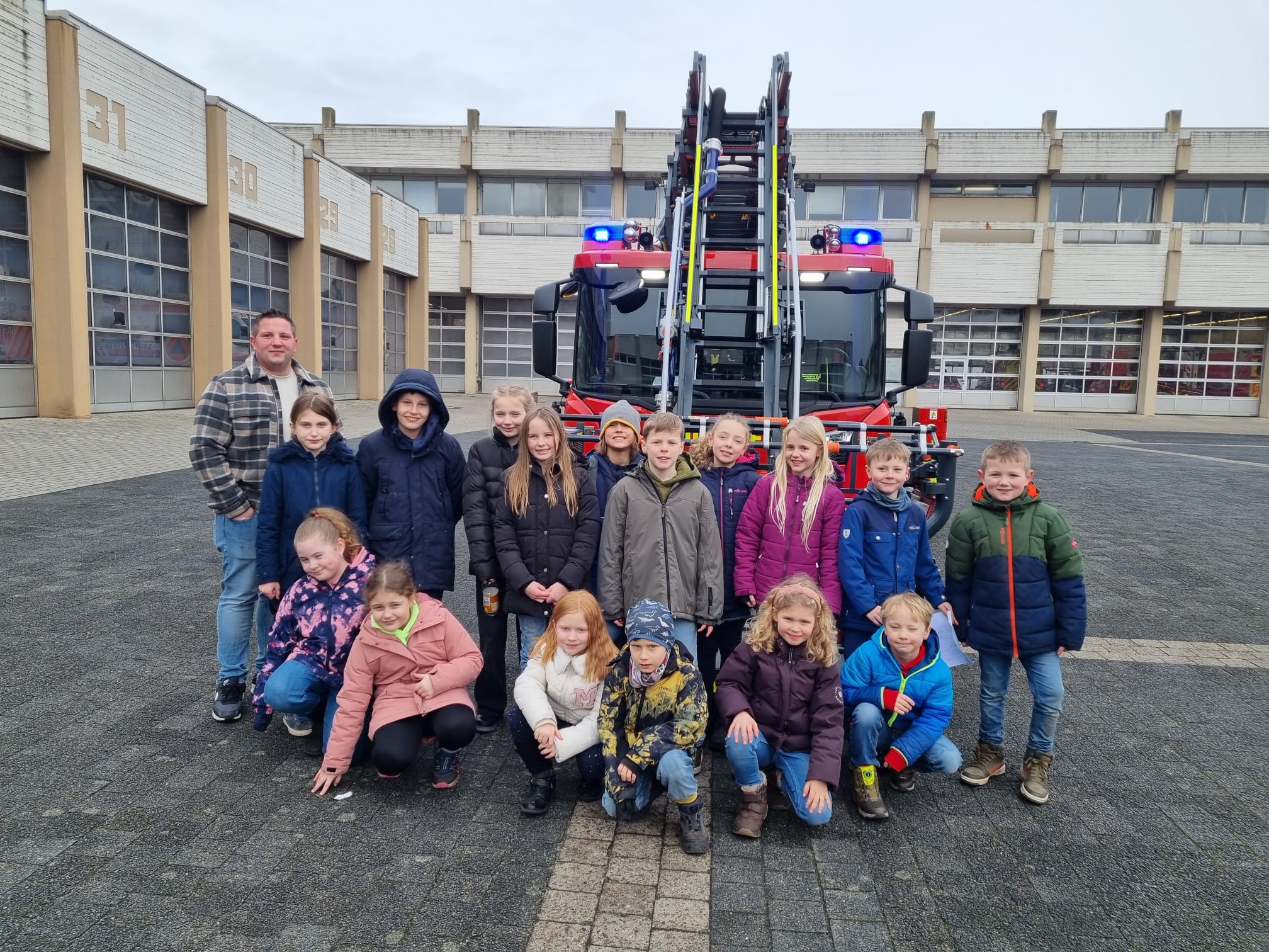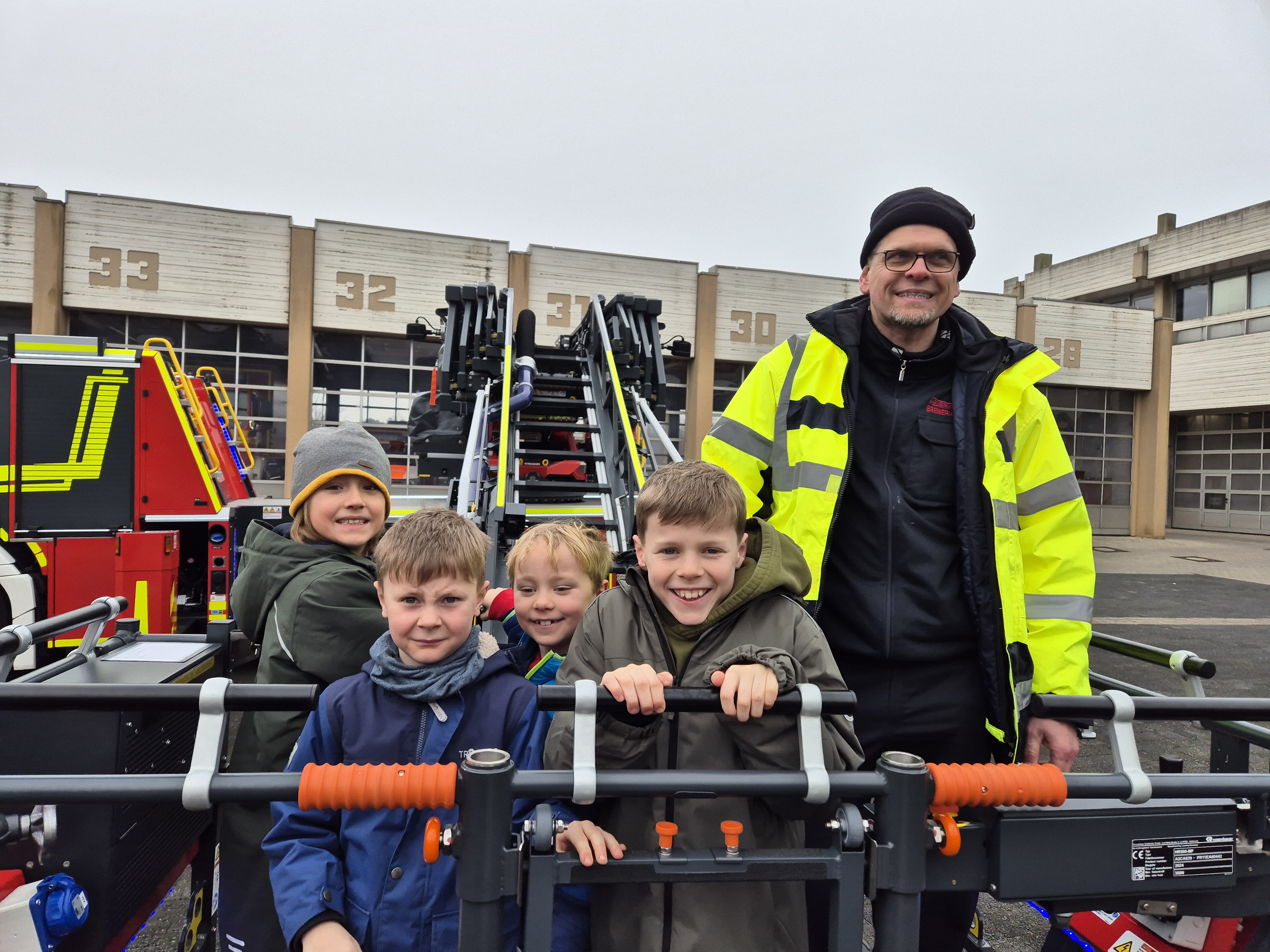 Einen regen Austausch von Profi zu Profi gab es jetzt für unsere Schulsanitäter in der Leitstelle der Feuerwehr Bremerhaven. Unterstützt von Eltern machte sich unsere Schulsanitäter-AG mit Herrn Röpke auf den Weg an die Wesermündung. Der Leitstellendisponet Erik Walker nahm sich Zeit, um unseren Sanis die Leitstelle Bremerhaven zu zeigen, alles zu erklären, aber auch um zu fachsimpeln. Natürlich wurden die verschiedenen Fahrzeug genau inspiziert, uneingeschränkter Höhepunkt war aber das Drehleiterfahrzeug. Jeder Sani, aber auch die Erwachsenen, hatten die einmalige Chance im Korb des Drehleiterfahrzeug auf 30 Meter hochzufahren. Bremerhaven von oben angucken - toll! Weitere (Höhe-)Punkte waren die Werkstätten, die Informationen über den Atemschutz nebst dazugehörigem Parcour und ein Probealarm. Auch für das leibliche Wohl wurde gesorgt. Beim gemeinsamen (Pommes-)Essen mit den dortigen Einsatzkräften wurde aber natürlich weiter gefachsimpelt. Unser Dank gilt Herrn Röpke, den helfenden Eltern und natürlich der Feuerwehr Bremerhaven! |