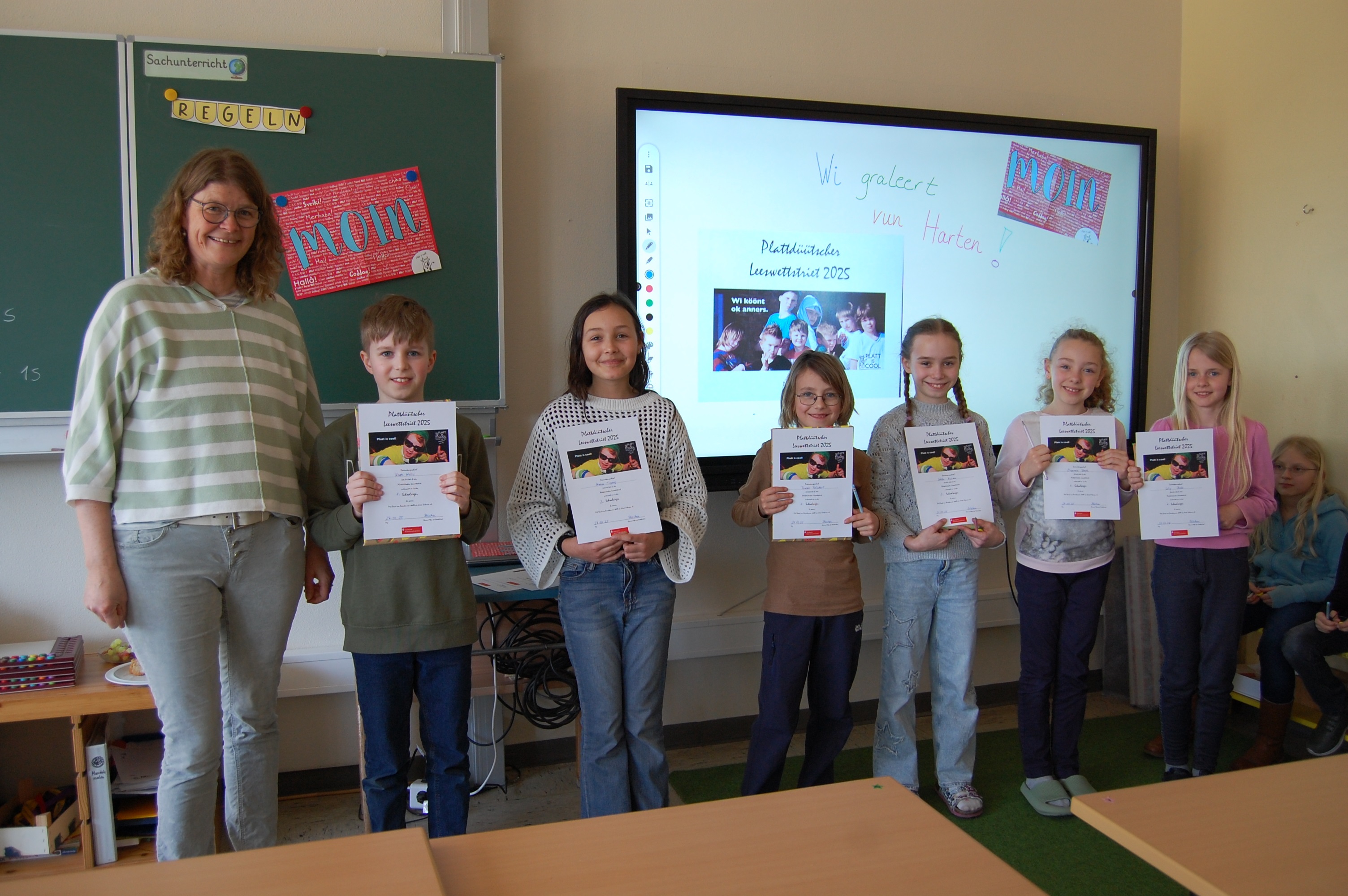 An Dönnerdag wuert bi uns soweit: Schoolentscheid för den plattdütschen Leeswettstriet 2025! 11 Schölerinnen und Schöler töven opgeregt op jümmern Vördrag för de Jury, de bestünn ut Edda Hillmann-Quest (TiO OHZ), Frau von der Heyde und Frau Böschen. De Jury wuer bannig beeindruckt von den Vörlesers und de Vördräg von den Texten. An´n End kunn sik för de 1. Platz dörsetten: Tammo Tolsdorf (3. Jahrgang) und Noah Wallis (4. Jahrgang). De 2. Plätze worrn belegt in den 3. Jahrgang mit Stella Kuzma und Eleonora Bock, in den 4. Jahrgang mit Lilly Bode und Amina Tiganj. Dat wuer een wunnerbaren Vormiddag op platt bi uns am Dreienkamp! Veelen Dank ok an all des Lesers de dit Johr dorüberhinut dorbi wuern! Veelen Dank an Frau Böschen! |