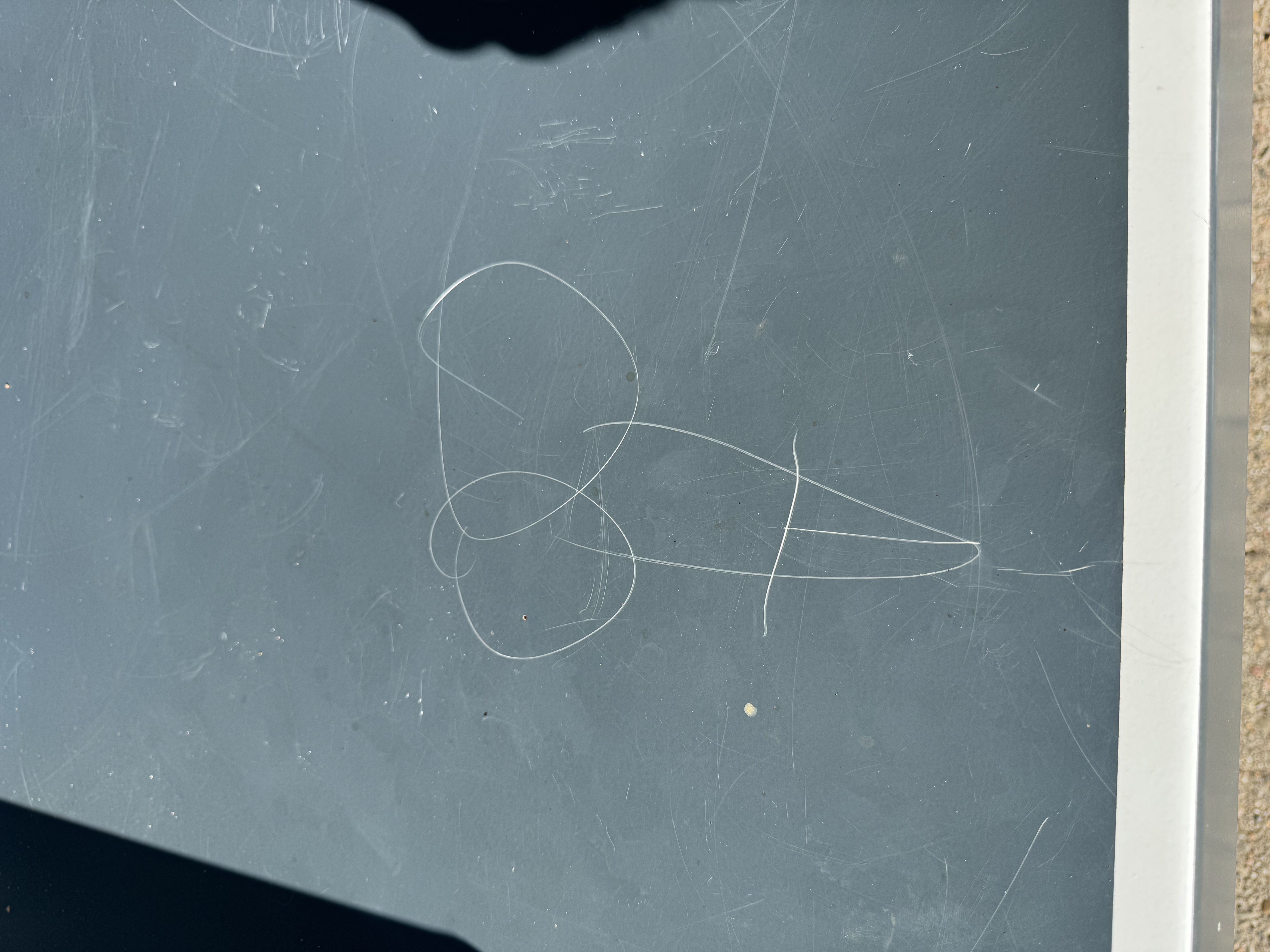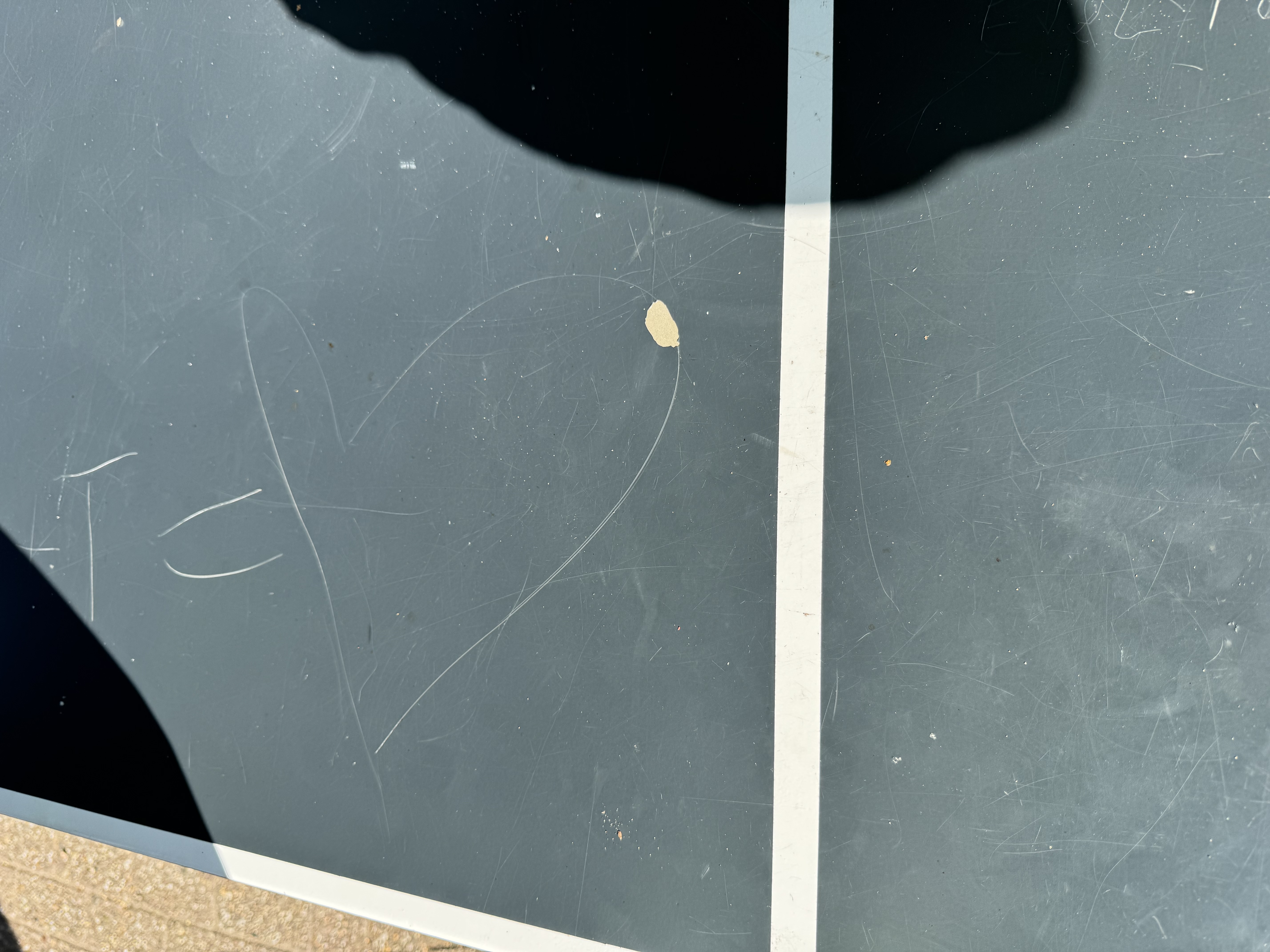 Unter anderem wurde diese "Eistüte" (Oder was soll es sein?) in eine Tischtennis-Platte geritzt ... |
